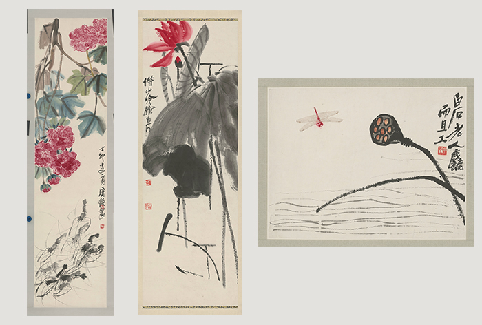 (图为本次展出的徐悲鸿、吴昌硕画作)