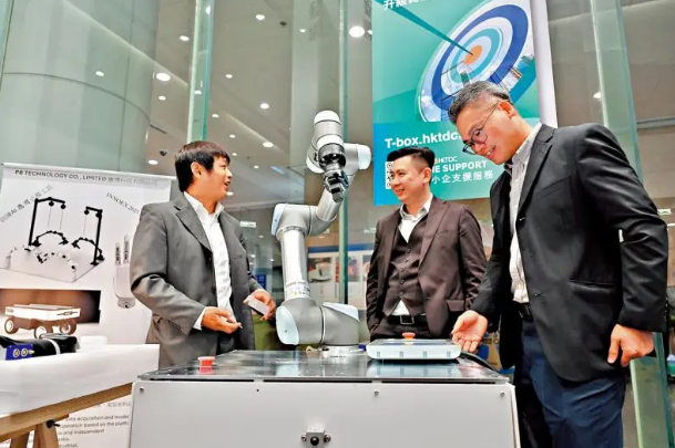 (图:4月13日至16日,香港会议展览中心举行第三届香港国际创科展、第二十一届香港春季电子产品展。图为展商展示协作机器人。中新社)