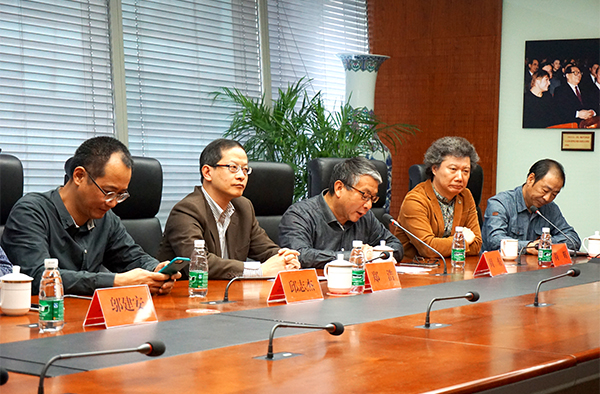 (左一:本届双年展中国馆策展人邱志杰、左二:文化部外联局局长助理郑浩、右二:中国美术家协会《美术》杂志社社长兼主编尚辉)