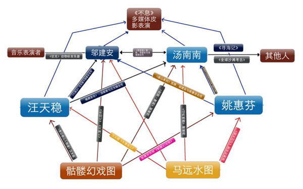 从工作方式来讲,四位参展艺术家将采用相互合作的方式,由此,传统手工技艺将与当代文化艺术产生强烈的碰撞与再生。姚惠芬将以精湛的上百种针法再现《骷髅幻戏图》,也将参与汤南南《遗忘之海》的创作。邬建安与皮影大师汪天稳已合作多年,在该展中将针对马远《水图》和山海意象展开新的创作。与此同时,出生于剧场世家的汤南南与皮影大师汪天稳,来自上海金山的邬建安与苏州的姚惠芬也将交叉产生出新作品。每位艺术家将分别与其它三位艺术家合作。同时,据邱志杰介绍,现场还将有策展人与艺术家、威尼斯大学中国留学生合作的现场表演。在这片交叉合作的网络中,传统分别由当代艺术家和民间艺术家所继承和阐释。