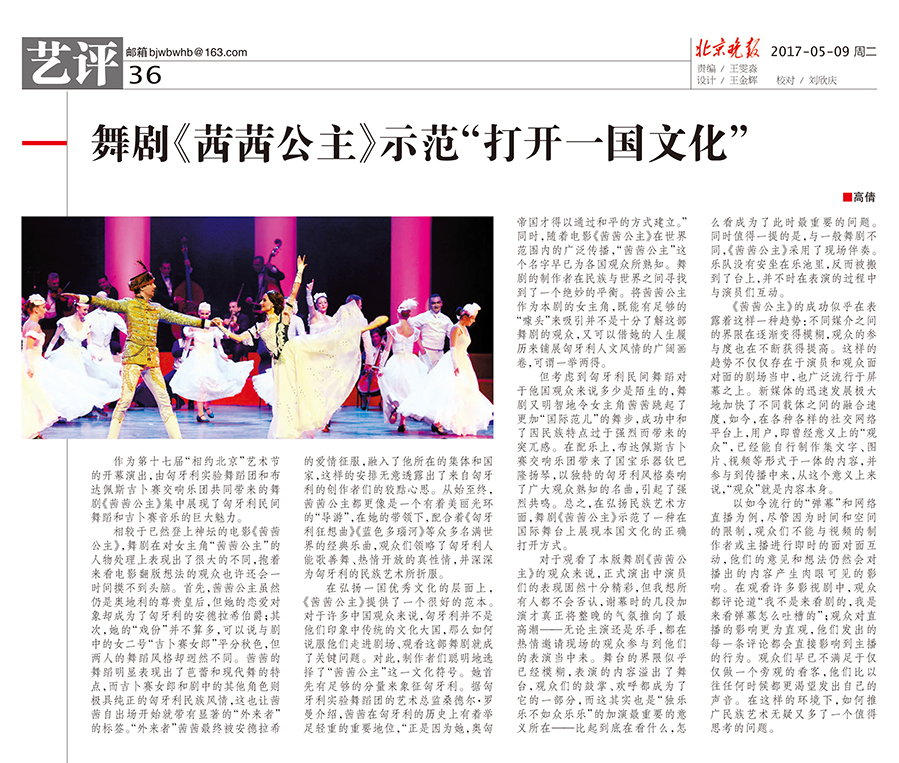 作为第十七届“相约北京”艺术节的开幕演出,由匈牙利实验舞蹈团和布达佩斯吉卜赛交响乐团共同带来的舞剧《茜茜公主》集中展现了匈牙利民间舞蹈和吉卜赛音乐的巨大魅力。