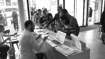 布鲁塞尔国家剧院大厅,网上订票观众在取票。