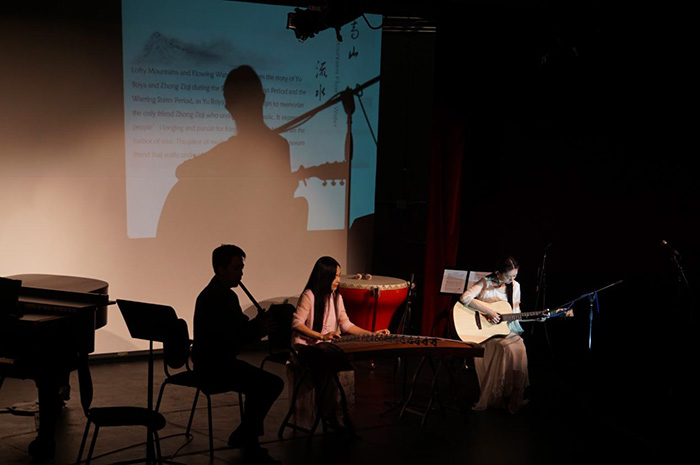 此次活动以“筝与诗”为主题,由中央音乐学院硕士生导师、古筝演奏家袁莎主讲,并与5位中国优秀青年艺术家——古筝演奏家白洋、岑佳蔚、钢琴家张正宸、打击乐演奏家吴昊与笛箫演奏家艾鸿波进行现场展示。袁莎讲述了古筝的历史渊源、基本构造、流派以及演奏技巧。她从中西文化对比的角度用古韵音符讲述乐曲与诗的渊源,还深入浅出地分析了诗歌与筝曲所蕴含的历史故事与文化内涵。活动还邀请校内的大提琴演奏家共同合奏,除古筝独奏外还采用了古筝+钢琴、古筝+吉他、古筝+大提琴等组合,配以中国鼓、萧等乐器,对中国名曲进行了创新演绎。艺术家们展示了包括《满江红》《出水莲》《大漠行》《钗风头》《高山流水》在内的多首中国名曲。