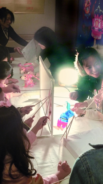 在马耳他中国文化中心举办的瓦莱塔“欢乐春节”新闻发布会上,观众围在展览演示区体验皮影 。 陈米硕 摄
