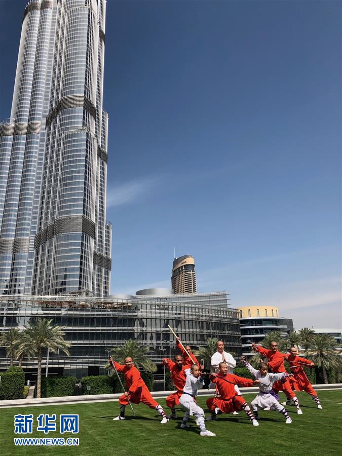 2月26日,在阿联酋迪拜,《武林时空》演员在世界第一高楼哈利法塔前亮相。大型综艺舞台剧《武林时空》27日在阿联酋迪拜歌剧院举行首场演出。《武林时空》由中国对外文化集团公司出品,自2000年首演以来足迹遍布世界近300座城市,成为国际演出市场经久不衰的“中国制造”品牌。新华社记者苏小坡摄