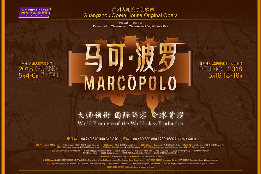 《马可·波罗》是"丝绸之路国际剧院联盟"成员单位中演院线广州大剧院独立创作的大型"丝路"主题歌剧,讲述痴迷东方文明的旅行家--马可·波罗披荆斩棘、几经波折,经丝绸之路往返中国的传奇故事。该部歌剧由享誉国际的伦敦科文特花园皇家歌剧院前歌剧总监卡斯帕·霍尔滕亲自执导,并邀请到了著名指挥大师汤沐海以及来自中国、丹麦、比利时和英国等国际优秀的艺术家参与创作、指挥和表演。《马可·波罗》还成功入选了国家艺术基金2018年度大型舞台资助项目。据了解,该剧在北京演出结束之后还将在丝绸之路沿线国家开展巡演。