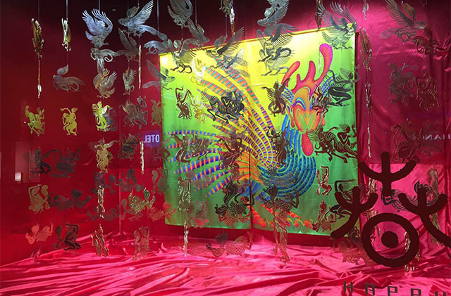 中国艺术在巴黎老佛爷集团这一顶级平台的首次登场必须亮眼,使得艺术家的选择成为关键,策展团队邀请到了中国新锐艺术家邬建安,他深谙中国传统文化又富有创新精神,擅长传统工艺的当代呈现。艺术家以农历鸡年为主题打造了两个艺术橱窗,借助中国传统剪纸与皮影的造型语言,使用铜板激光镂刻的技术,展现一幕雄鸡与上古神话人物对话的神奇故事。在中国传统神话故事里,昴日星官是上天二十八宿之一,本相是六七尺高的大公鸡,司职“司晨啼晓”,是呼唤日出象征光明的神祗,因此“昴日星官”成为了农历鸡年艺术橱窗的主体形象。