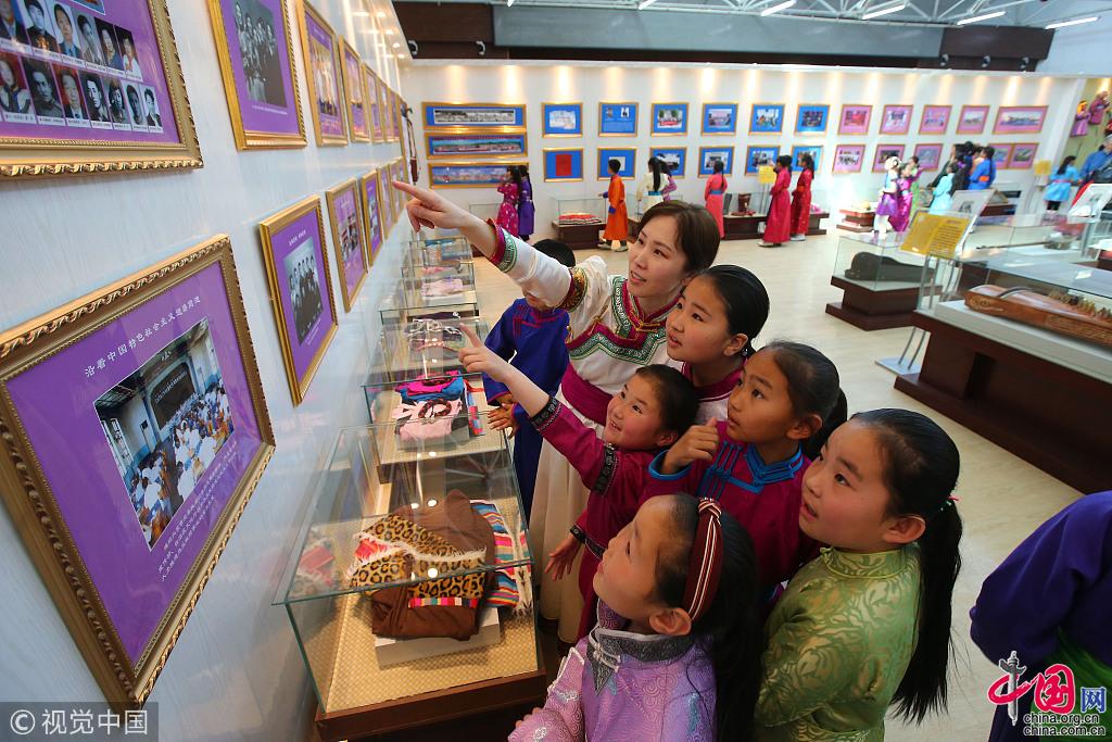 苏尼特少儿合唱团40余名成员分别来自苏尼特右旗第三小学和蒙古族小学,平时分别在各自学校练习,周末集中合练。许多牧区的孩子都牺牲了周末回家的时间坚持参加合唱训练。来自蒙古族小学五年级1班的伊乐贡就是其中一员,由于要参加合唱训练,他总是与远在牧区的爸爸妈妈聚少离多,但他还是坚持了下来。合唱团的孩子在乌兰牧骑纪念馆参观。