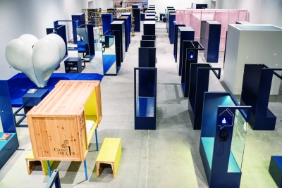 此次展览作品形式以建筑设计与装置居多,分为香港、澳门、内地3个展厅,不同展厅的艺术家作品都带有极强的地域性符号,显现出不同地区的鲜明城市特征。步入香港展厅,一道道蓝色的“墙”将展厅瞬间隔成了多个小区间,在里面游走宛如穿梭于迷宫一般。据策展人梅诗华介绍,此次香港展区以“建谈城市相遇”为主题,通过“分隔”“印象”“家”“记忆”4个部分,展现了8位青年建筑设计师的装置和互动媒体创作,呈现空间设计如何塑造都市人的生活形态。而如此设计展场则是为了把“香港”搬进展厅,这样观者走在其中就犹如来到了香港拥挤的城市街道之中,不经意间在某一拐角处突然出现的艺术作品则像是在香港被高度利用的土地上,隐匿其中的某栋有趣建筑一般。“在城市中这种相遇是随时的、令人惊喜的,此次呈现的都是在香港很日常的建筑或元素,建筑师们希望能从本土建筑的角度出发,与观者分享这种在城市中相遇的机会和感受,从而进一步探讨城市、空间与人的关系。”梅诗华说。