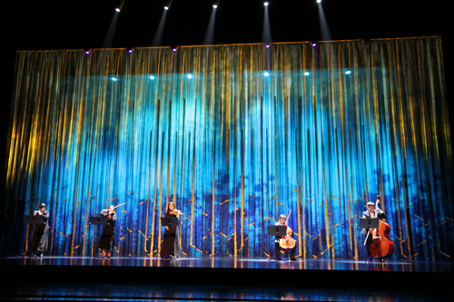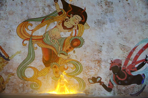 琵琶声悠扬而起,声声入耳,敦煌壁画在琴声中徐徐展开,空灵的乐音仿佛将观众带回到远古的敦煌,演出在一曲《丝路飞天》琵琶独奏声中缓缓拉开序幕。