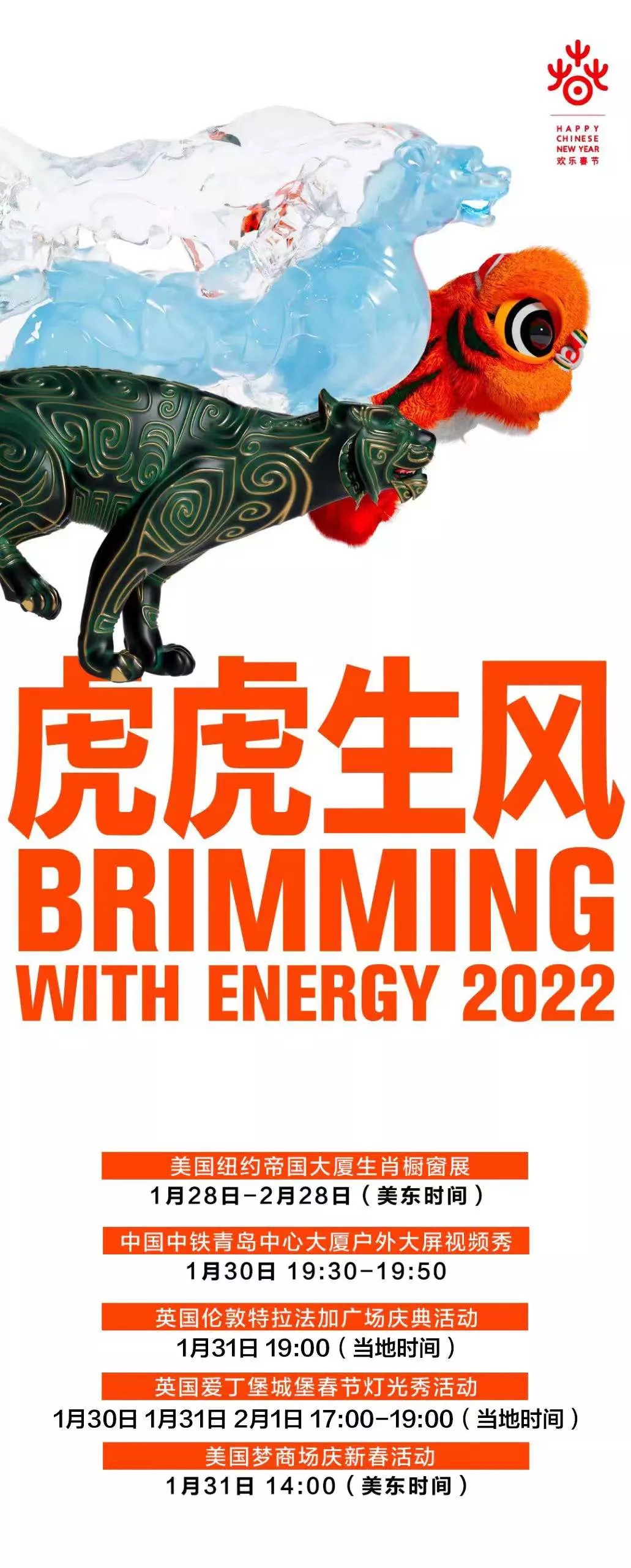 本次橱窗展共分为短视频和图文展示两个部分,短视频以"虎虎生风"为主题,视频中的错金银铜虎、白玉灵虎和布艺老虎,取材于中国不同历史时期"虎"的形象,奔跑的三只老虎分别传达了"虎啸生风""四时和顺""福佑安康"的美好祝愿,以多元创意的艺术形式为当地民众送上中国的新春祝福。该视频还在春节期间亮相于美国新泽西州美国梦商场新春活动、苏格兰爱丁堡城堡春节灯光秀、英国伦敦特拉法加广场新春庆典,以及中国中铁青岛中心大厦户外大屏视频秀。奔跑的生肖虎,跨越时空、飘洋过海串联起了这四个城市,所到之处引发各国观众的赞叹和喜爱。正如中国驻纽约总领事黄屏在美国新泽西州梦商场新春活动的致辞中表示,美国人民有"美国梦",中国人民也有"中国梦",中美两国人民的梦想都承载着对美好生活的追求,这也是世界各国人民共同的梦想。央视新闻频道、人民日报、中国日报、光明日报和凤凰新闻等主流媒体对相关活动予以报道。