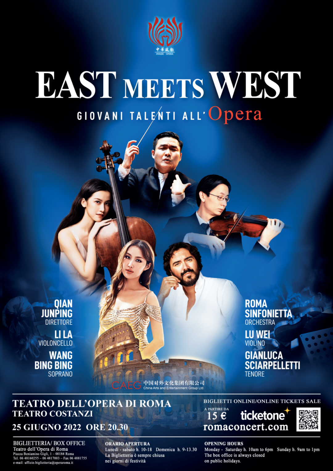 本场音乐会继续由中国青年指挥家钱骏平执棒,并特邀自中意两国活跃在世界舞台的独奏和独唱音乐家与意大利罗马交响乐团合作演出,其中包括小提琴家陆威、大提琴家李拉、女高音王冰冰以及意大利男高音詹卢卡·西阿佩里逖。
