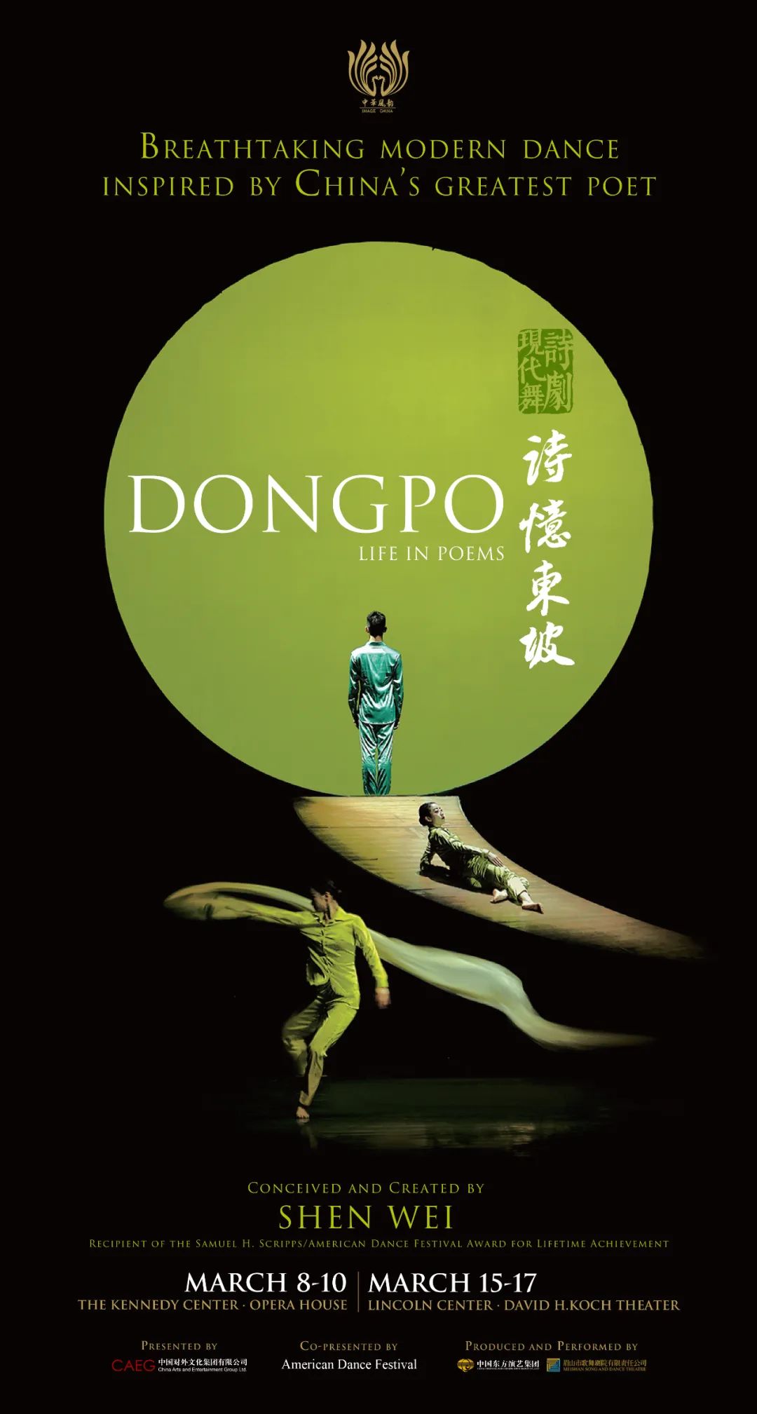 在中国对外文化集团有限公司“中华风韵”品牌推动下,现代舞诗剧《诗忆东坡》即将于今年3月8日至17日期间,在美国华盛顿肯尼迪中心歌剧院和纽约林肯中心大卫·寇克剧院演出8场。该剧由国际著名编导、舞蹈家、画家与视觉艺术家沈伟领衔创作,中国东方演艺集团有限公司联合眉山市歌舞剧院有限责任公司倾力打造,是一部立足中国传统文化、对标国际市场和国际审美表达、大胆探索中外艺术融合的创新之作。