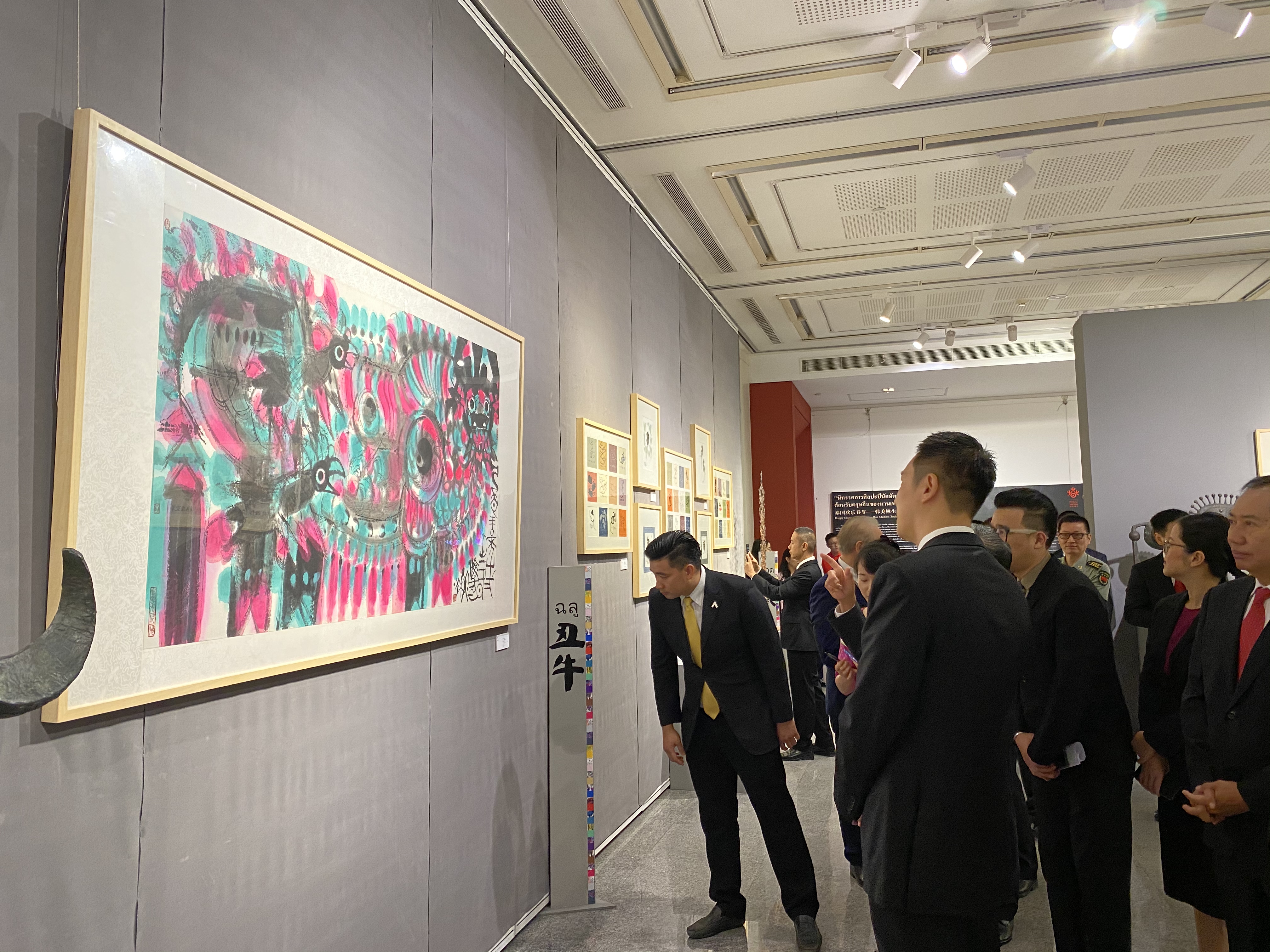 1月21日,中泰嘉宾在曼谷中国文化中心参观泰国“欢乐春节”活动——“韩美林生肖艺术展”。