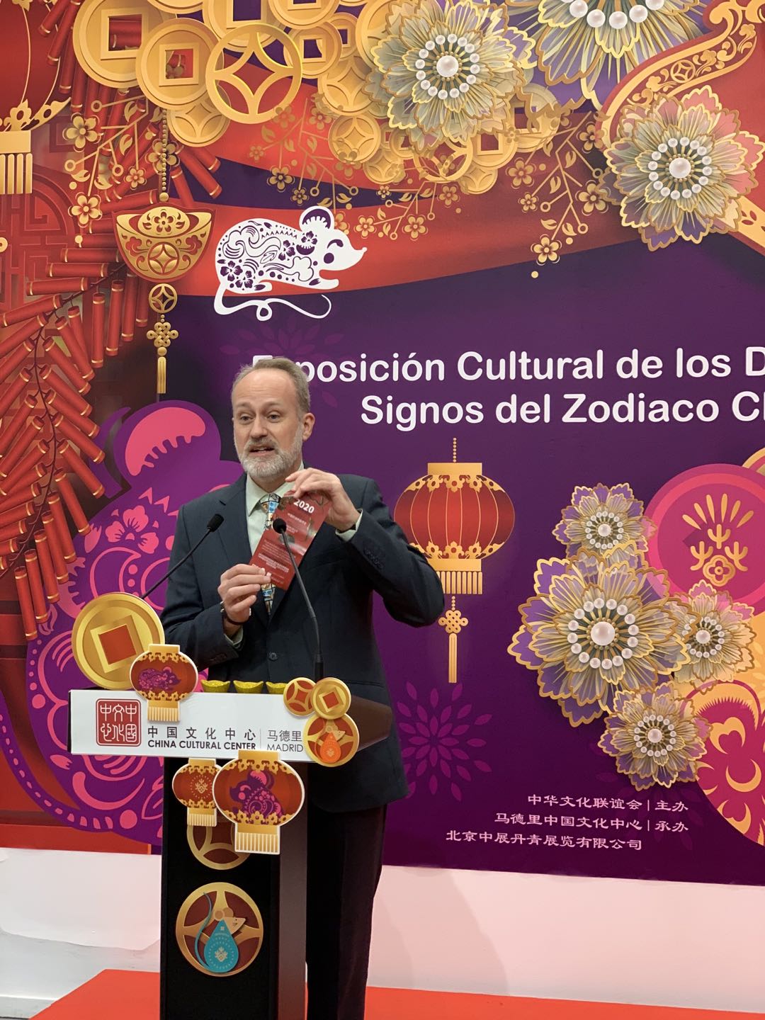 1月22日,“金鼠报吉”中国十二生肖文创展在西班牙马德里中国文化中心开幕,现场嘉宾致辞。